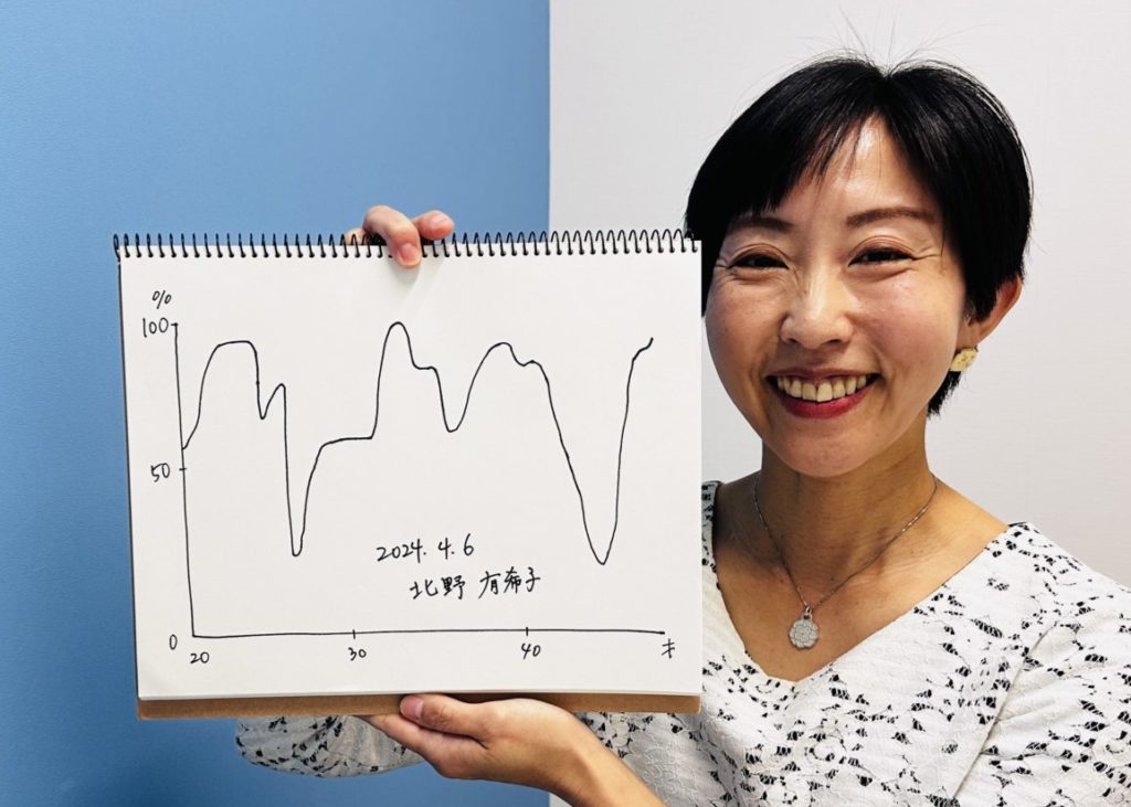 北野さんにこれまでの歩みをお話しいただくにあたり、その時々の感情の動きを表す「ライフラインチャート」を書いていただきました。横軸が年齢、縦軸がモチベーションや満足度、幸福度です。北野さんのキャリアのターニングポイントはいつだったのでしょうか?
